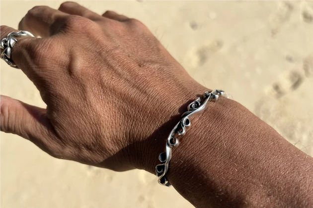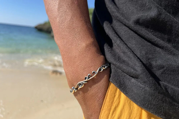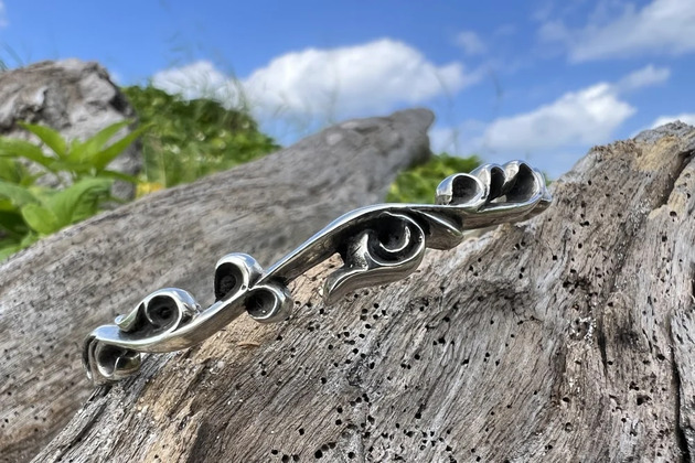 荒波をモチーフに滑らかさとエッジ感を両立させたバングルです。魚釣りやサーフィンなどのマリンスポーツシーンだけでなく普段使いにもおすすめ。潮風、日焼けした肌、ロッドを握る手に似合よく似合います。海で生きる大人のために作った無骨で静かに主張するシルバーバングル。
